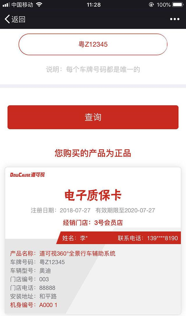 同時(shí),用戶可以直接查詢到安裝的產(chǎn)品是否為道可視正品360°全景環(huán)視系統(tǒng)產(chǎn)品,杜絕偽冒產(chǎn)品。